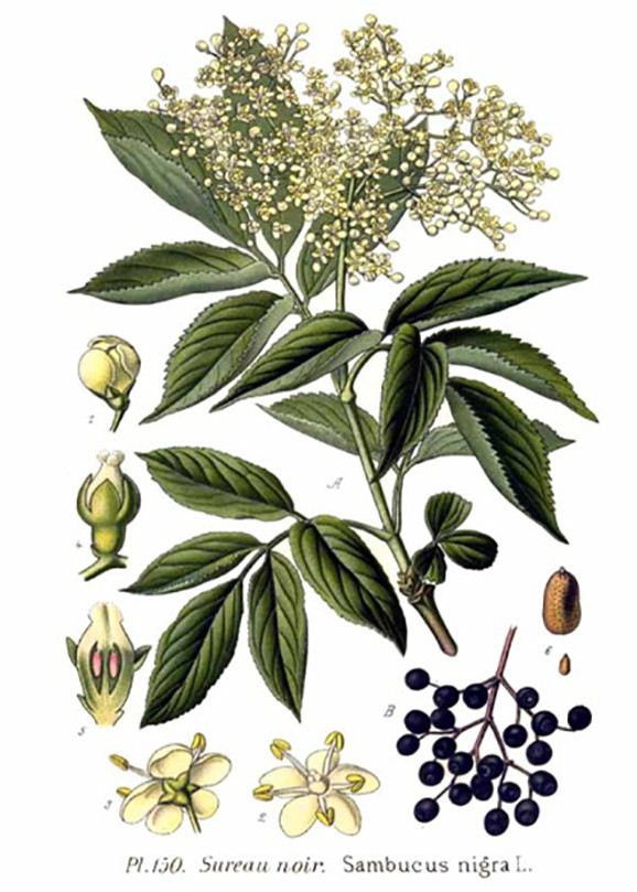 The latin name of Elder is Sambucus nigra is composed of "Sambucus" which in ancient Greek comes from "sambúkē", a string music instrument, made from the wood of the elder tree. "nigra" means "black", and refers to the dark berries. Since Hippocrates, the Elder has a very great fame. We use the flowers, leaves, the second bark, berries for multiple domestic or medical uses. Berries and flowers have antioxidant, anti-inflammatory and immune enhancing properties. Berries work on the airways and are prepared as cough syrup.